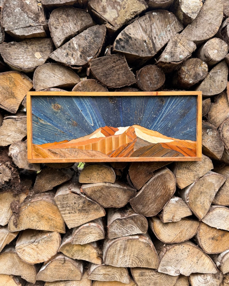 Venture into the beauty of the PNW with this handcrafted wooden landscape mosaic. Inspired by the iconic Mt. St. Helens, this piece captures the mountain’s bold silhouette and distinctive charm. With its warm tones and handmade character, it adds a perfect touch of wilderness to any room.